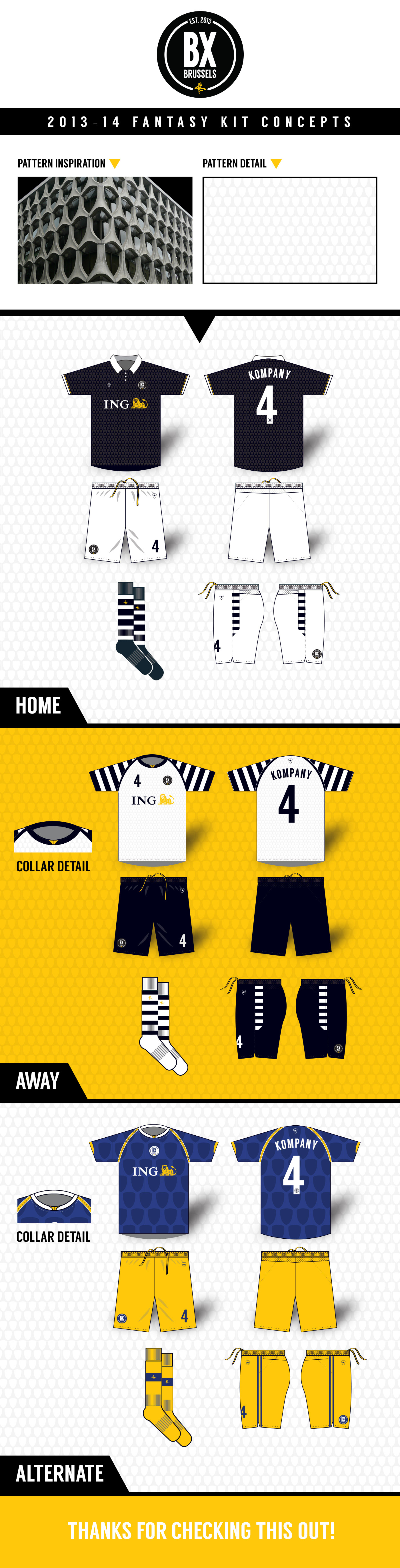 Created these fantasy soccer kits for BX Brussels back in 2013 for fun. I wanted to show some design thinking in terms of linking the kits directly back to the city they're located.