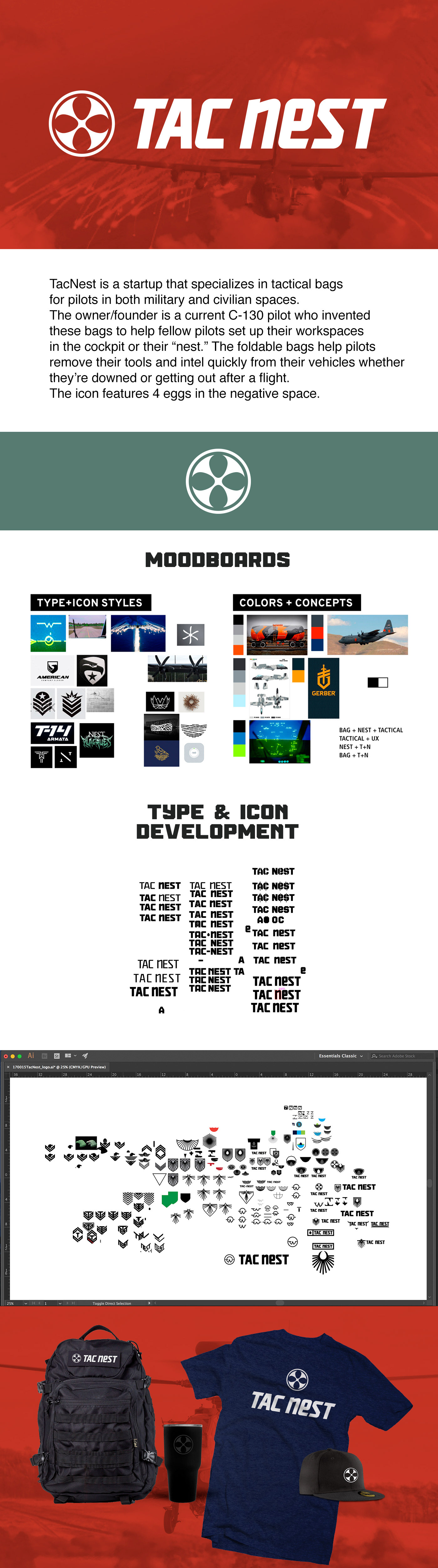 Logo & branding project for TacNest. They build tactical pilot bags for military and civilian spaces. American made and pilot owned.